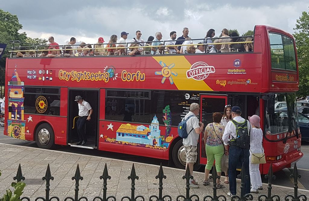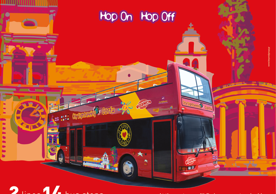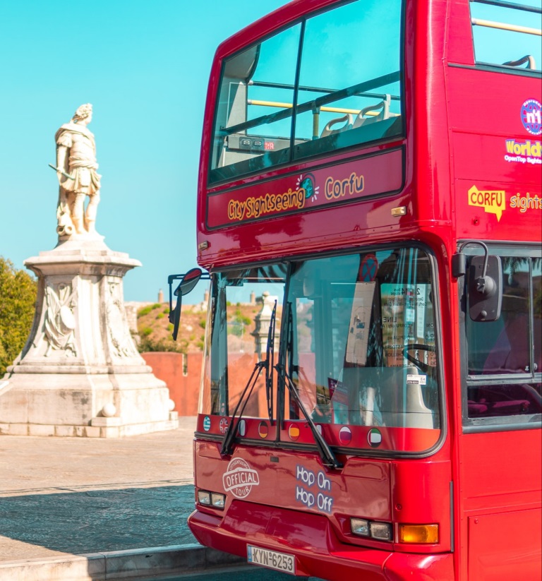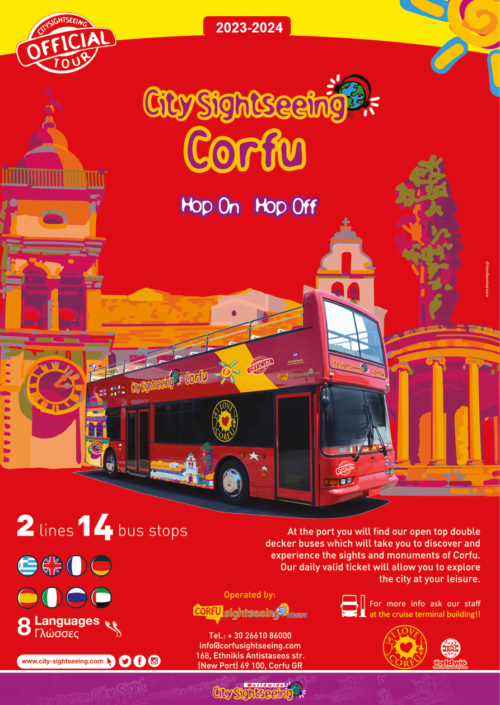 At the port you will find open top double decker buses which will take you to discover and experience the sights and monuments of Corfu. The daily valid ticked will allow you to explore the city at your leisure 2 Lines 14 Bus stops 8 Languages